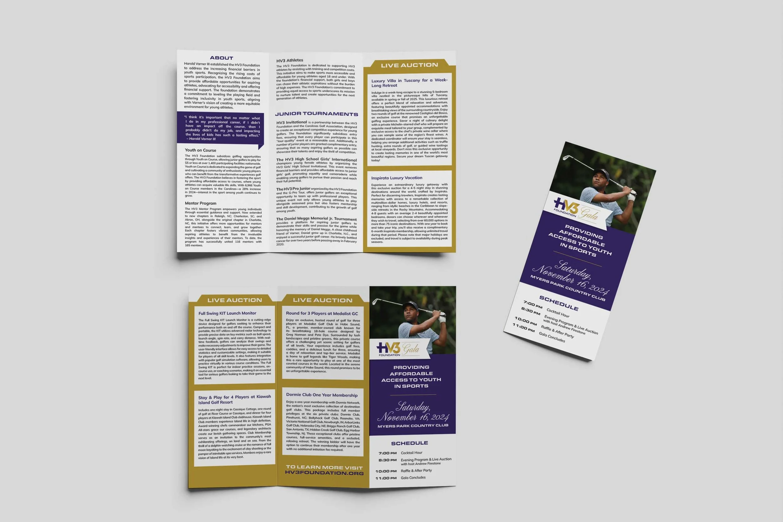 Over the years HV3 Foundation has requested several printed and digital pieces to promote sponsorship and their annual Gala. Working within their brand guidelines, I created and produced printed pieces including a Save the Date, Sponsorship flyers, Gala tri-fold and brochures. Each piece was created to showcase the foundation’s good work in the community while adhering to their color palette and brand guidelines. Gala pieces were given a slightly more upscale look with the addition of gold elements.